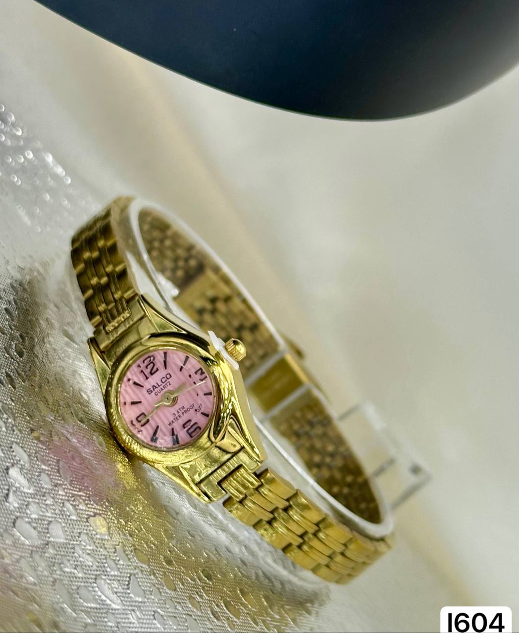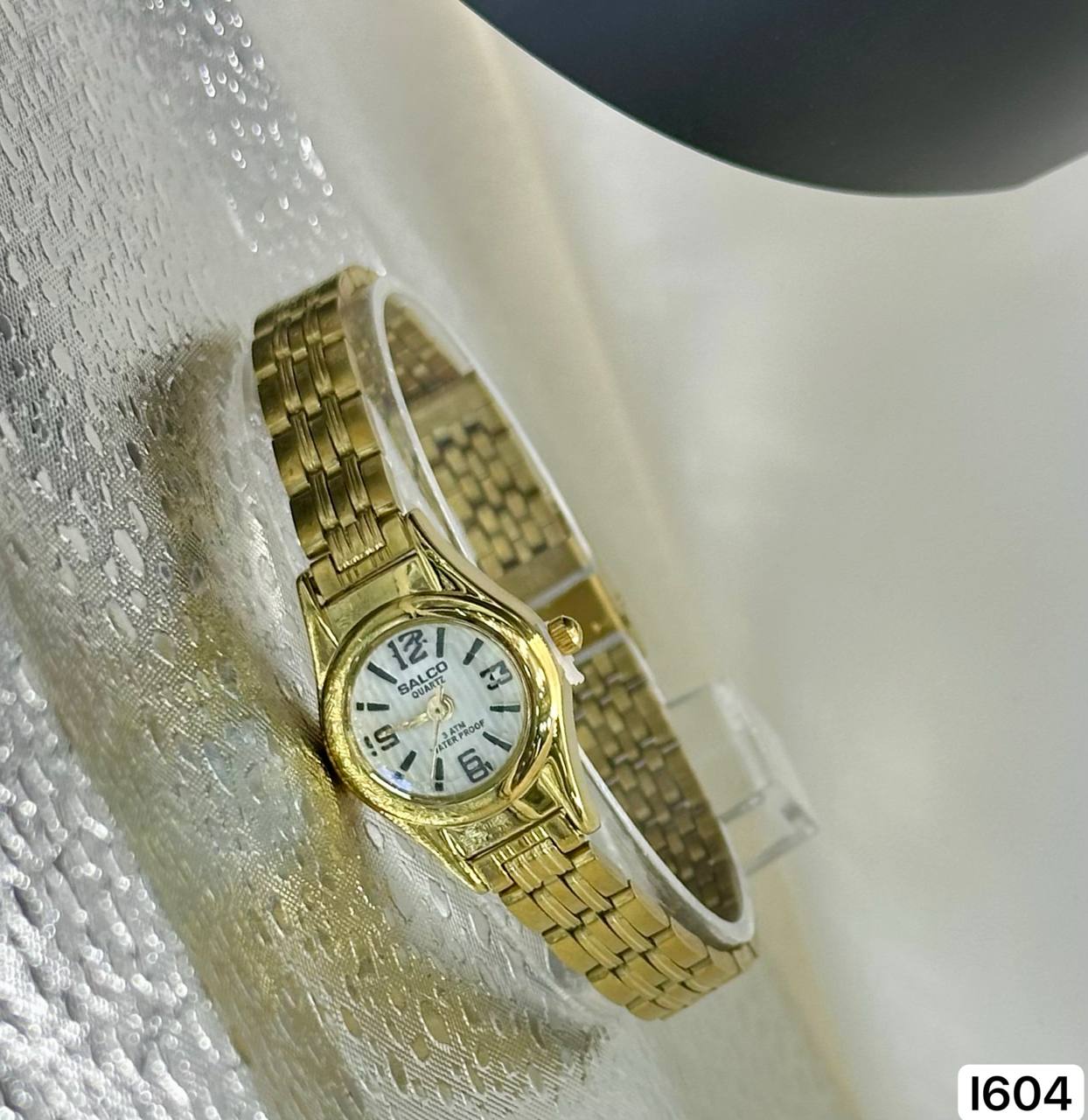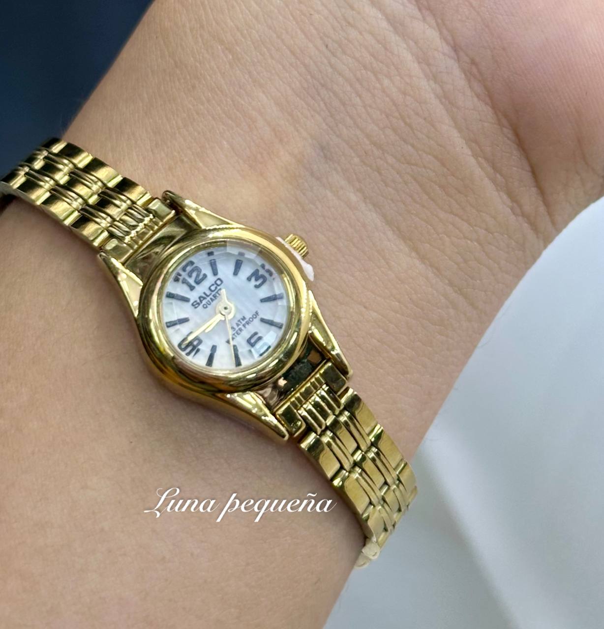 -Diseño: Pulsera dorada, con números arábigos en las posiciones de las 12 y las 6.