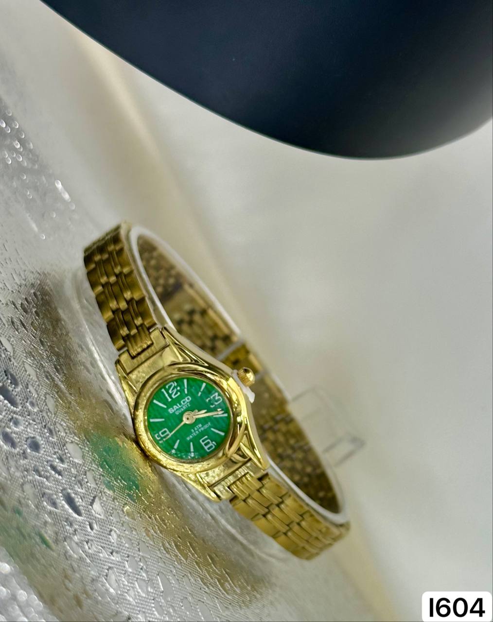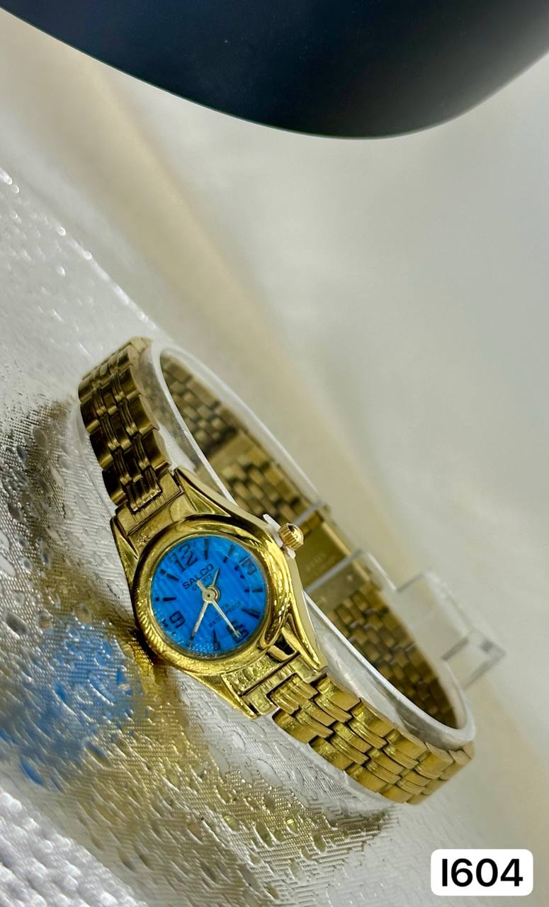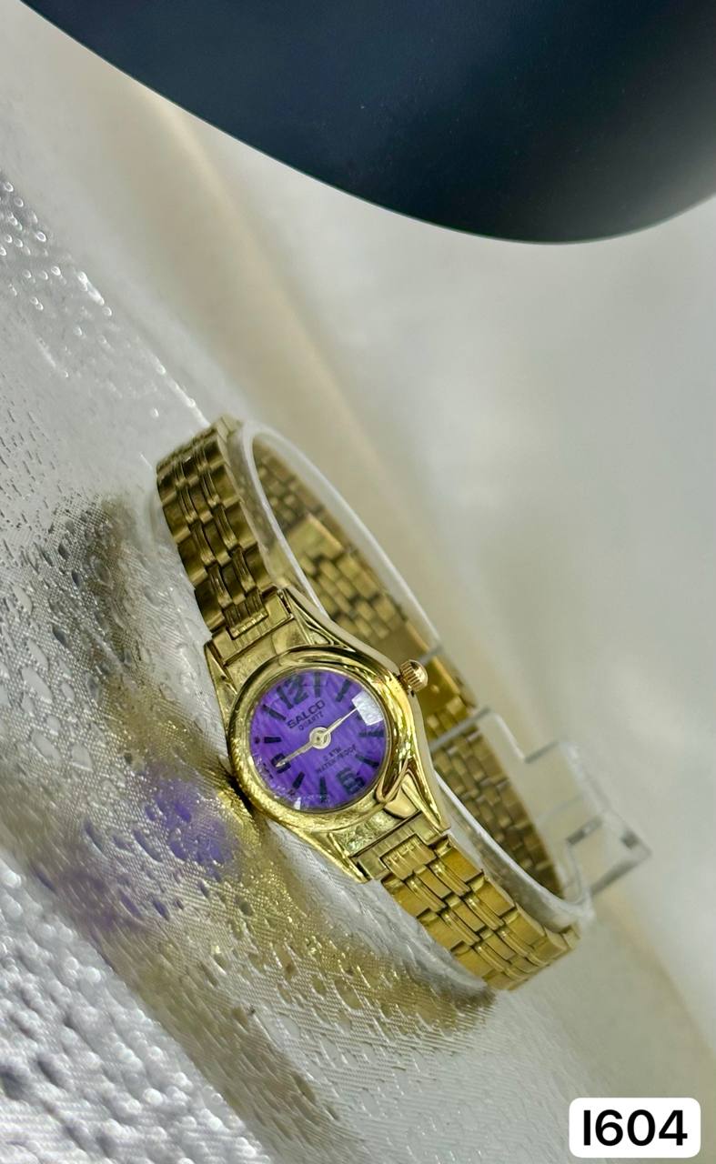 -Diseño: Pulsera dorada, con números arábigos en las posiciones de las 12 y las 6.