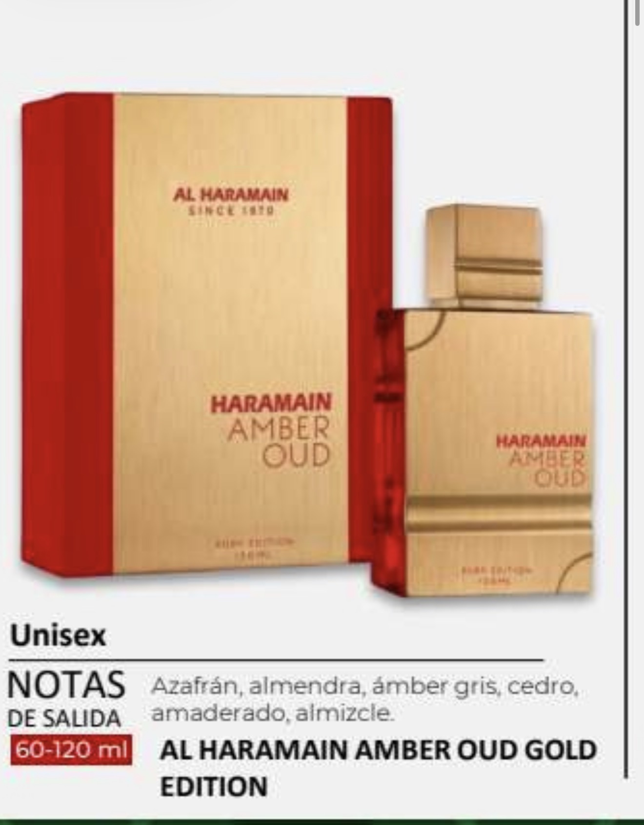 Al Haramain Amber Oud Gold Edition Rojo calidad 1.1, perfume unisex con aroma dulce-amaderado y súper elegante. Tiene duración aproximada de 10 horas en cuerpo y ropa, excelente proyección y una estela que se siente lujosa y llamativa. Perfecto para salir de noche, ocasiones especiales y personas que quieren destacar.