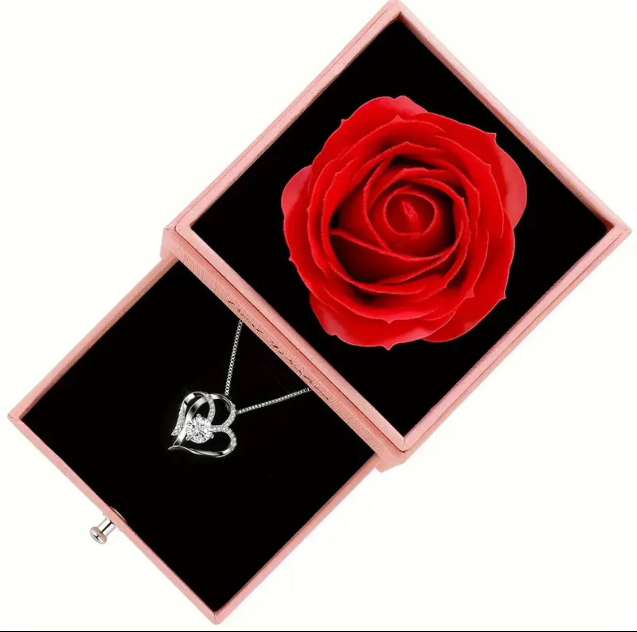 ¿Buscas un detalle que sea elegante y romántico a la vez? Este conjunto ha sido diseñado para cautivar. Presentamos un sofisticado collar en forma de corazón, alojado en una exclusiva caja de presentación coronada por una hermosa rosa roja. Es la elección ganadora para San Valentín, aniversarios, o esa sorpresa especial que ella nunca olvidará.