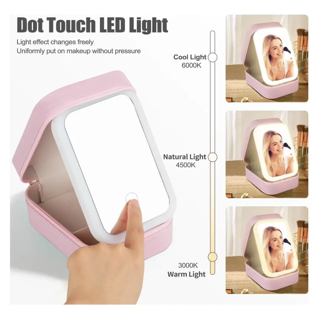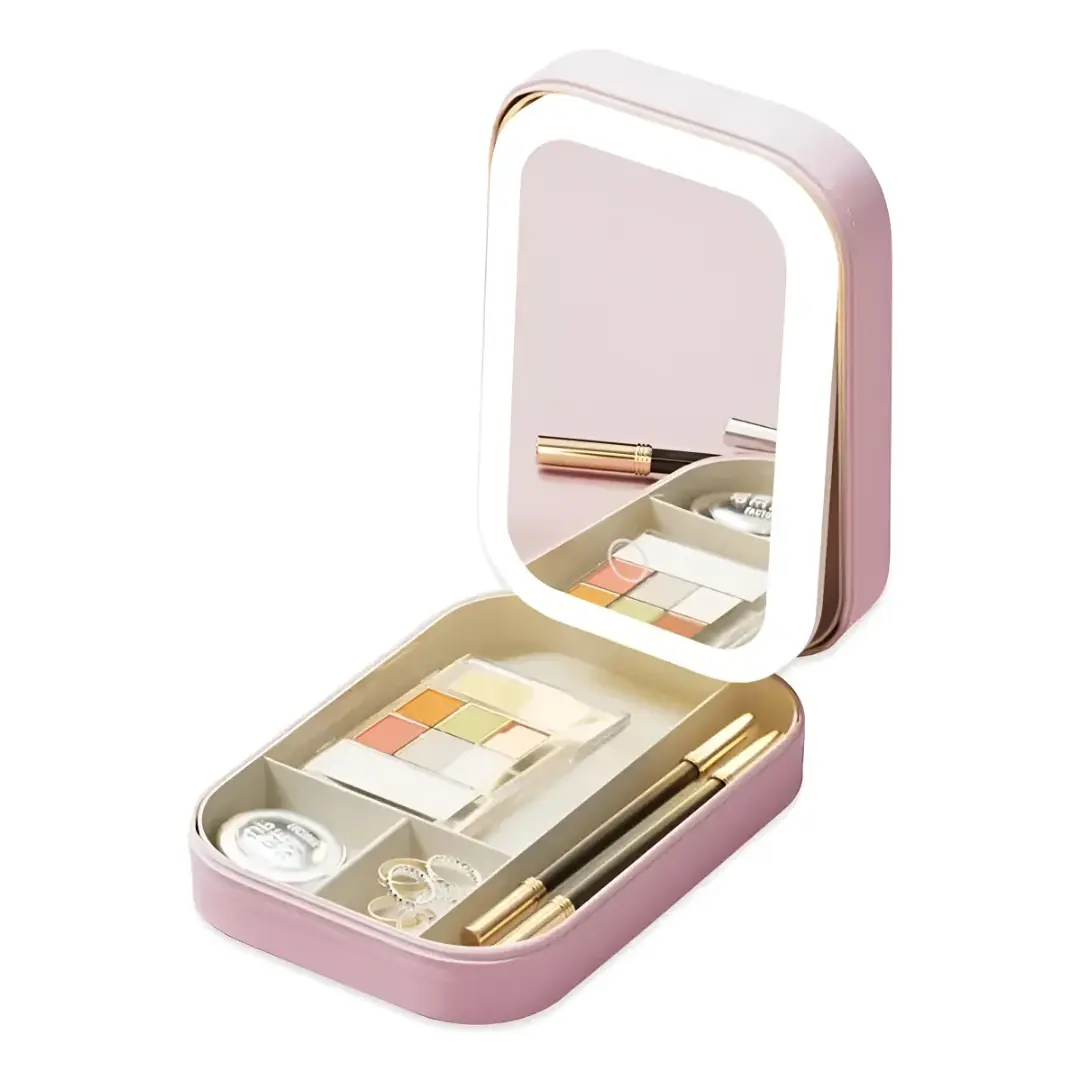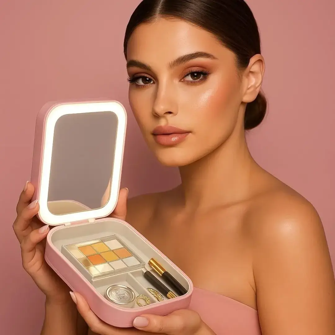 Organiza tu maquillaje de manera práctica y elegante con este moderno estuche portátil. Su diseño compacto y funcional incluye espejo con luz LED integrada, ideal para lograr un maquillaje perfecto en cualquier lugar y momento.