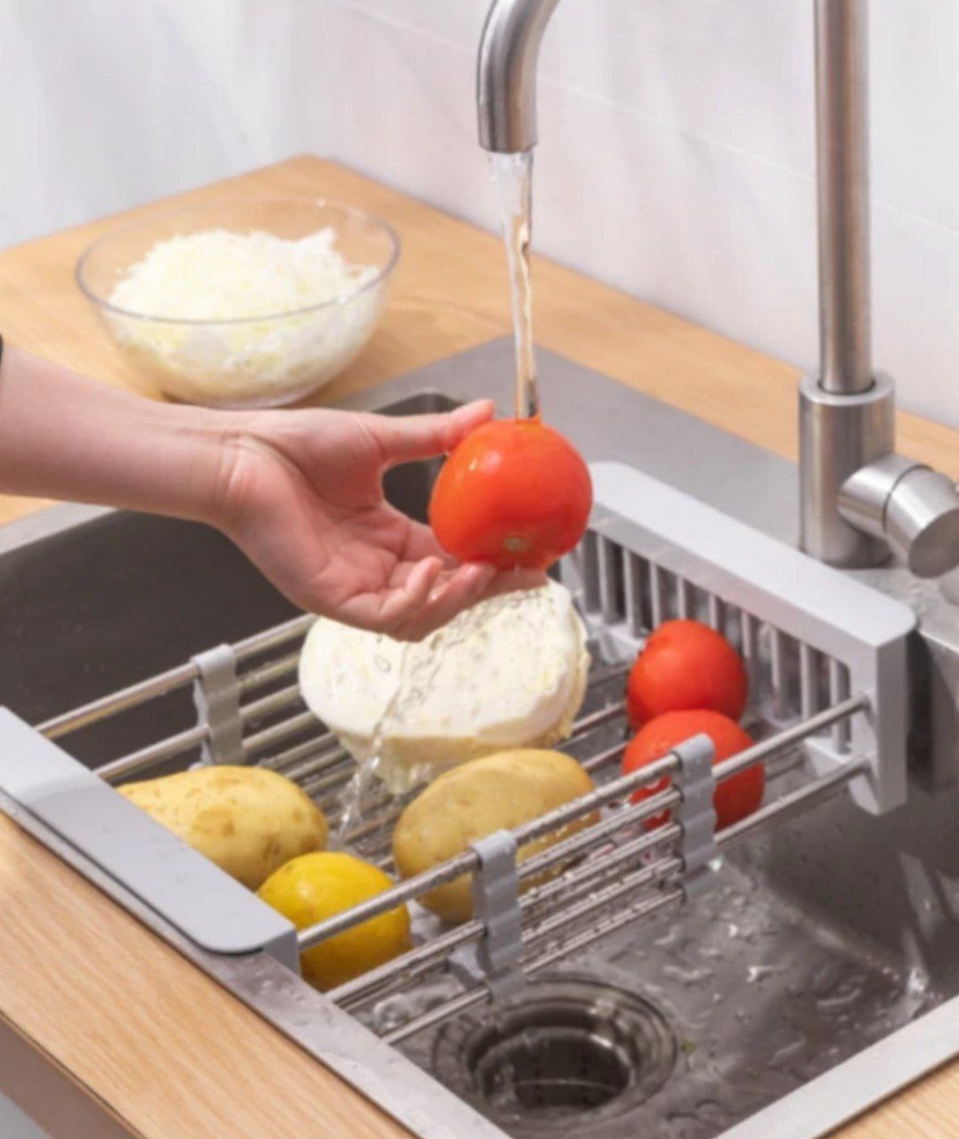 Optimiza el espacio en tu cocina con nuestro Escurridor de Platos Expandible para Fregaderos, una herramienta versátil y moderna que se adapta a tus necesidades. Su diseño innovador te permite secar platos, escurrir frutas y verduras, o incluso descongelar alimentos directamente sobre el fregadero, liberando espacio en tu encimera.
