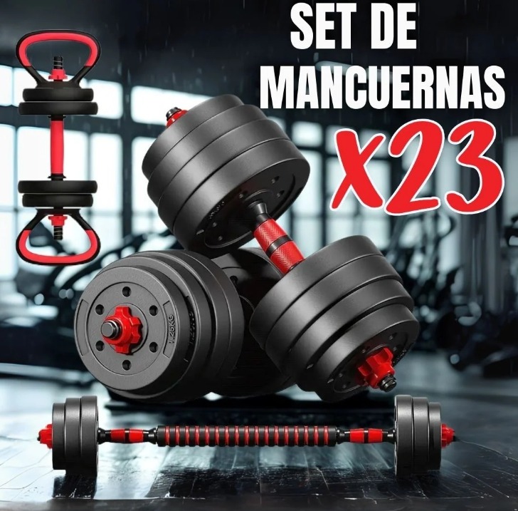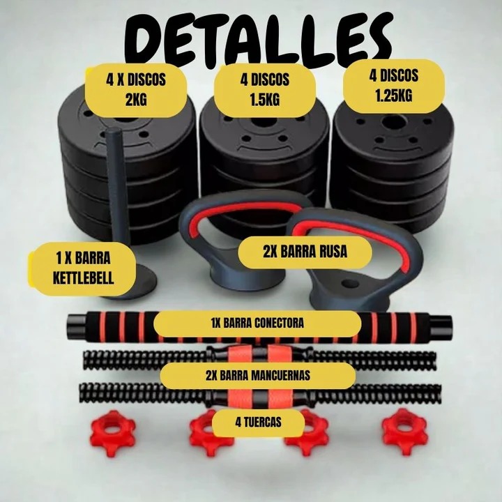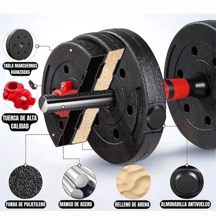 Este set multifuncional es perfecto para entrenar en casa sin necesidad de comprar múltiples equipos. Su diseño inteligente te permite convertirlo en mancuernas, barra recta, barra rusa o incluso soporte para flexiones, adaptándose a tus rutinas y objetivos de entrenamiento.