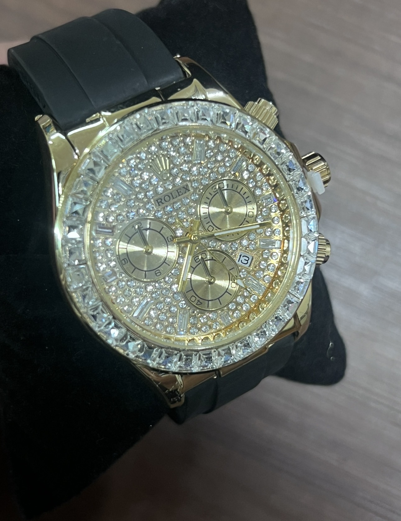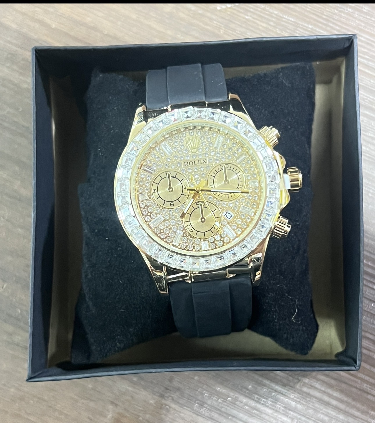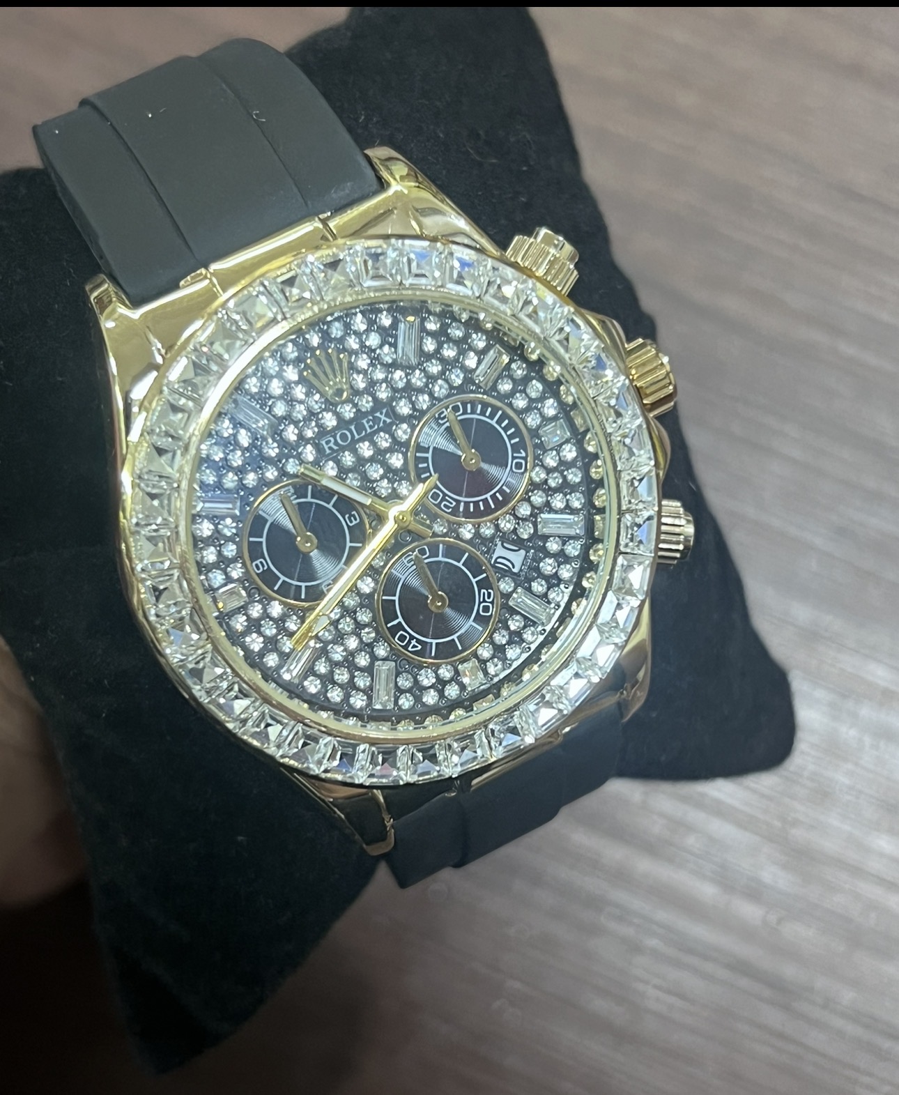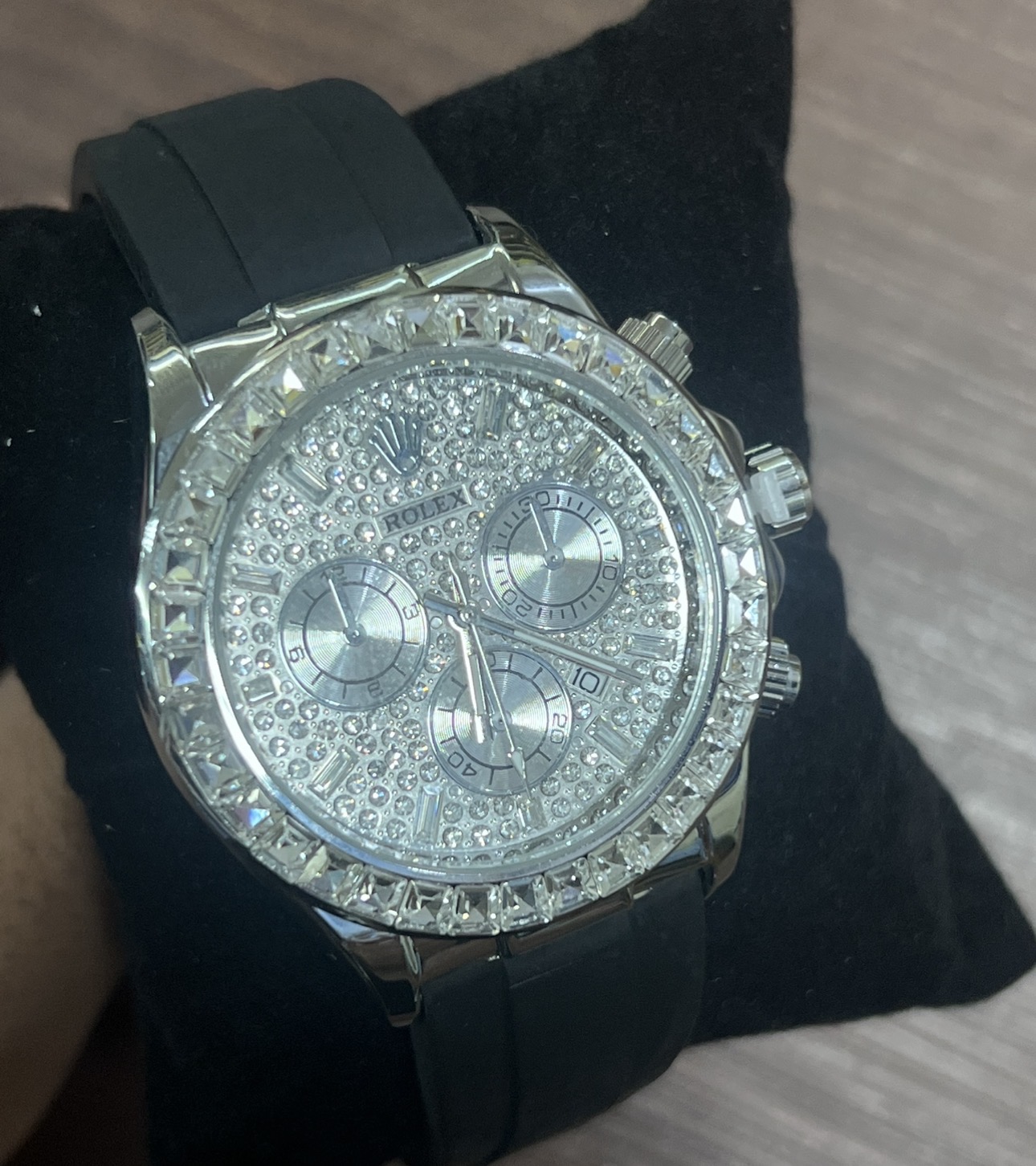 Luce estilo, brillo y presencia con este Rolex Daytona de caucho, un modelo pensado para quienes buscan un reloj llamativo, elegante y moderno. Su esfera llena de detalles y su bisel con piedras lo convierten en una pieza que destaca al instante.