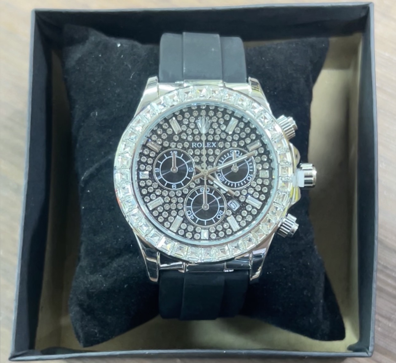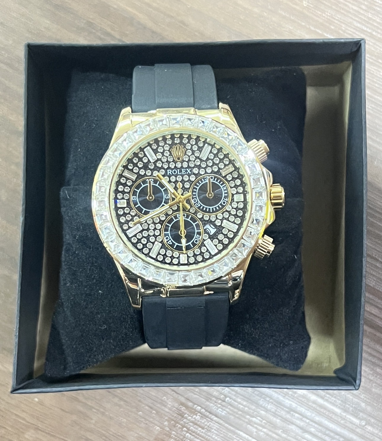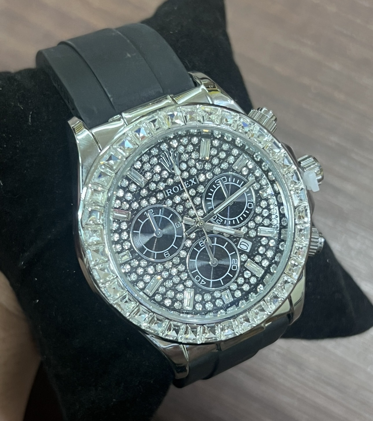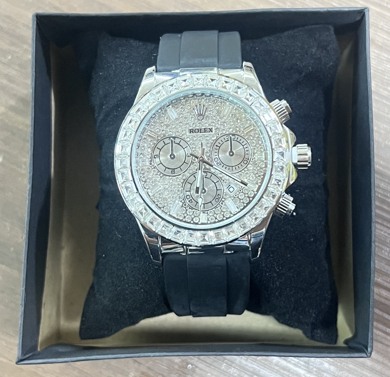 Luce estilo, brillo y presencia con este Rolex Daytona de caucho, un modelo pensado para quienes buscan un reloj llamativo, elegante y moderno. Su esfera llena de detalles y su bisel con piedras lo convierten en una pieza que destaca al instante.